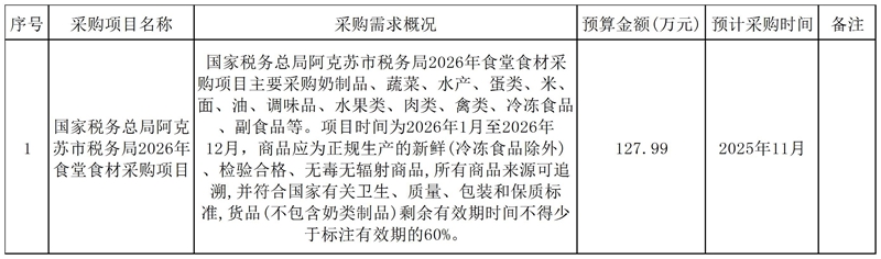 为便于供应商及时了解政府采购信息,根据《财政部关于开展政府采购意向公开工作的通知》(财库〔2020〕10号)等有关规定,现将国家税务总局阿克苏市税务局2025年11月至12月采购意向公开如下: