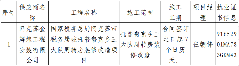 | 标题 | 国家税务总局阿克苏市税务局驻托普鲁克乡三大队周转房装修改造项目中标(成交)结果公告 | ||