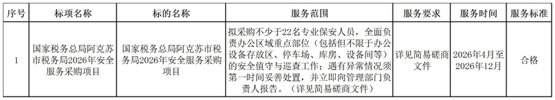 | 标题 | 国家税务总局阿克苏市税务局2026年安全服务采购项目中标(成交)结果公告 | ||