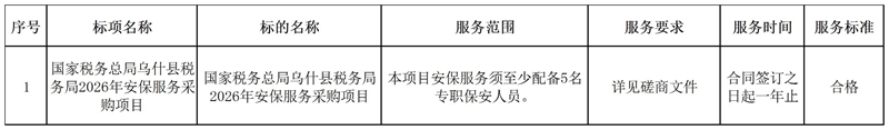 | 标题 | 国家税务总局乌什县税务局2026年安保服务采购项目中标(成交)结果公告 | ||