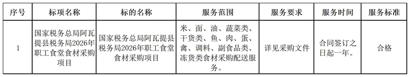 | 标题 | 国家税务总局阿瓦提县税务局2026年职工食堂食材采购项目中标(成交)结果公告 | ||