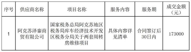 | 标题 | 国家税务总局阿克苏地区税务局库车经济技术开发区税务分局关于两套周转房维修项目中标(成交)结果公告 | ||