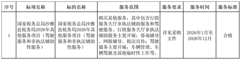 二、项目名称:国家税务总局沙雅县税务局2026年其他服务项目(驾驶服务和非执法辅助性服务)
