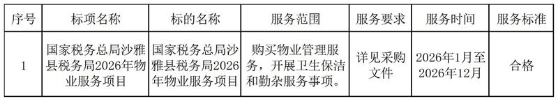 | 标题 | 国家税务总局沙雅县税务局2026年物业服务项目中标(成交)结果公告 | ||