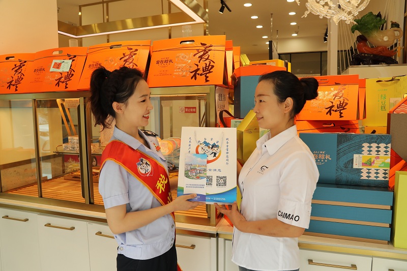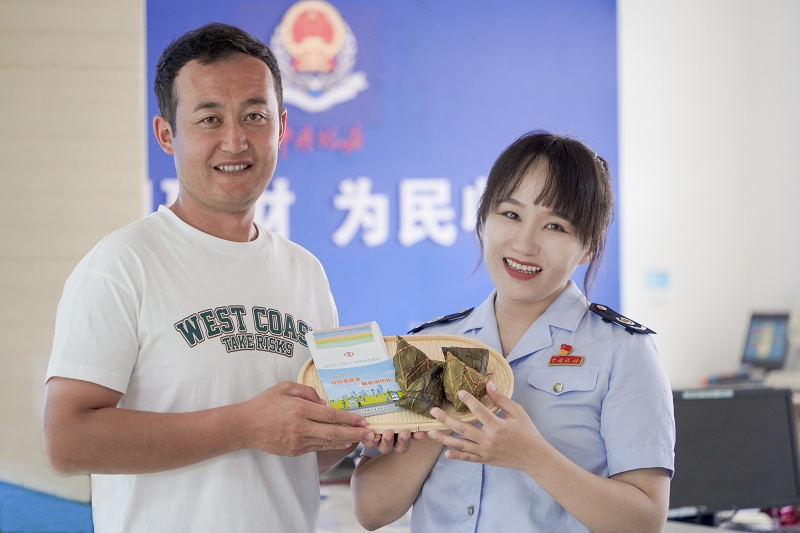图为 青河县税务局开展“税说端午”活动,税务干部为纳税人送上温暖的节日祝福及税费优惠政策讲解