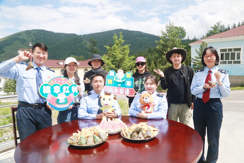 图为 端午临近,正值旅游旺季,布尔津县税务局喀纳斯税务所干部邀请游客一起“知税收 过端午”