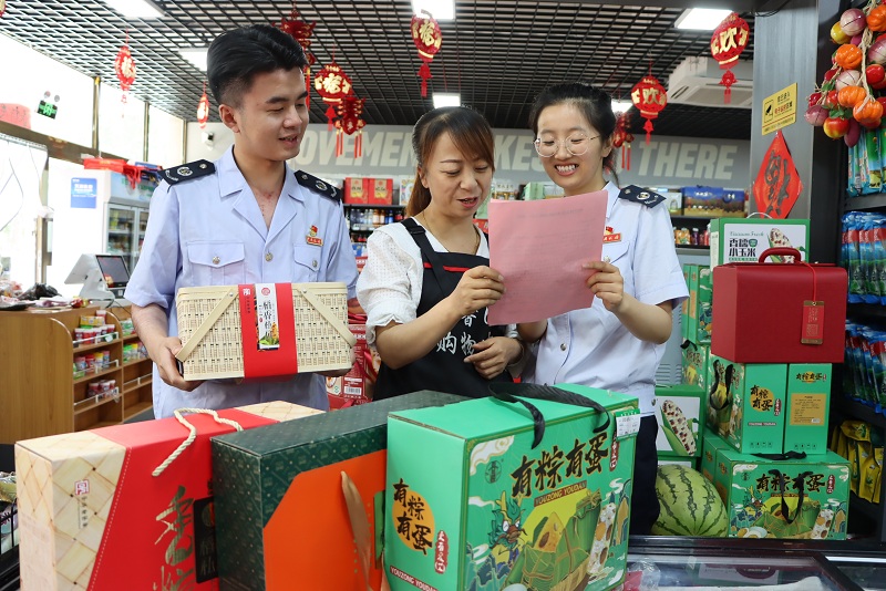 图为 哈巴河县税务局“税宣青锋”服务队走访辖区大型商超,了解纳税人经营状况,针对即将到来的端午销售旺季,为其提供精准服务