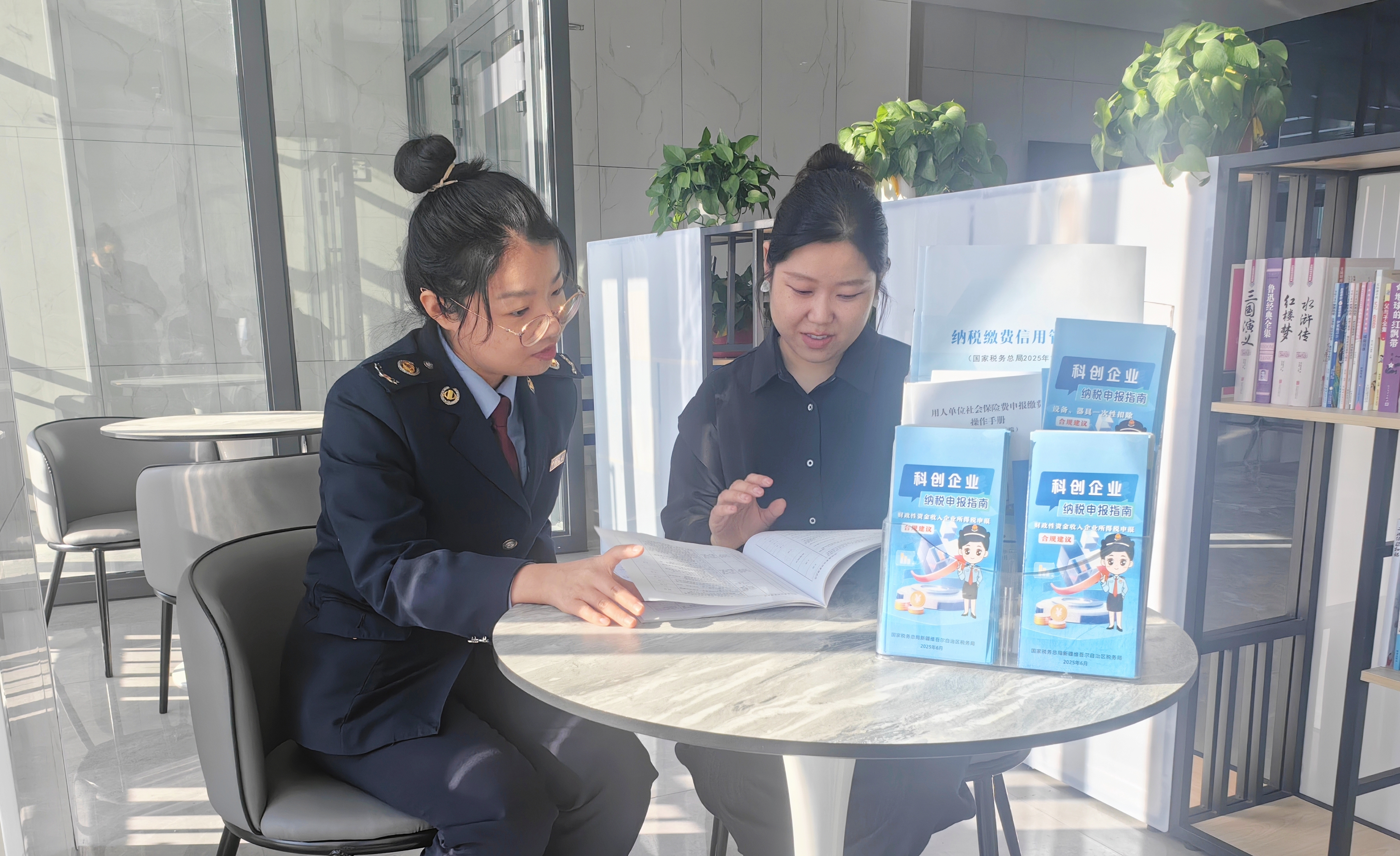 国家税务总局福海县税务局干部为新开业户进行“一对一”办税指导,引导纳税人合规经营、诚信纳税。