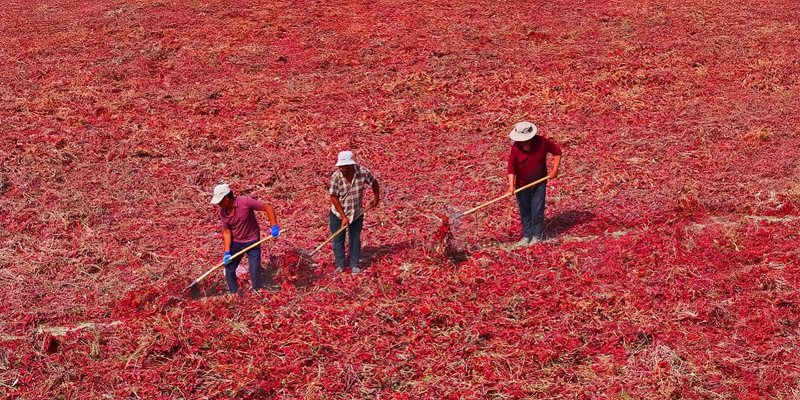 天山南麓,博斯腾湖畔,新疆维吾尔自治区巴音郭楞蒙古自治州和硕县19.05万亩辣椒迎来采收晾晒旺季,这项工作将持续至10月底。 和硕县地处焉耆盆地核心区域,辣椒种植面积常年稳定在18万亩以上,品种涵盖红龙23、裕红115等工业椒及红安7号等鲜食椒,是新疆重要的优质辣椒生产基地。近年来,和硕县持续优化种植环境,依托天山雪水灌溉与年均3000小时以上的充足日照,推广标准化种植技术,并划定戈壁晾晒区,保障辣椒品质与产量稳定提升,2025年预计年产干椒11万余吨。 国家税务总局和硕县税务局紧扣辣椒采收季,梳理农产品自产自销、农业生产资料减免、小微企业税收优惠等政策,制作辣椒产业链专属“税惠大礼包”,开展“进田间、访企业、送服务”活动,精准对接种植户与辣椒加工企业需求,开展政策辅导。