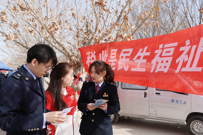 图为 且末县税务局在园丁公园举行第35个全国税收宣传月启动仪式暨“沙海杏花·税宣同行”主题活动
