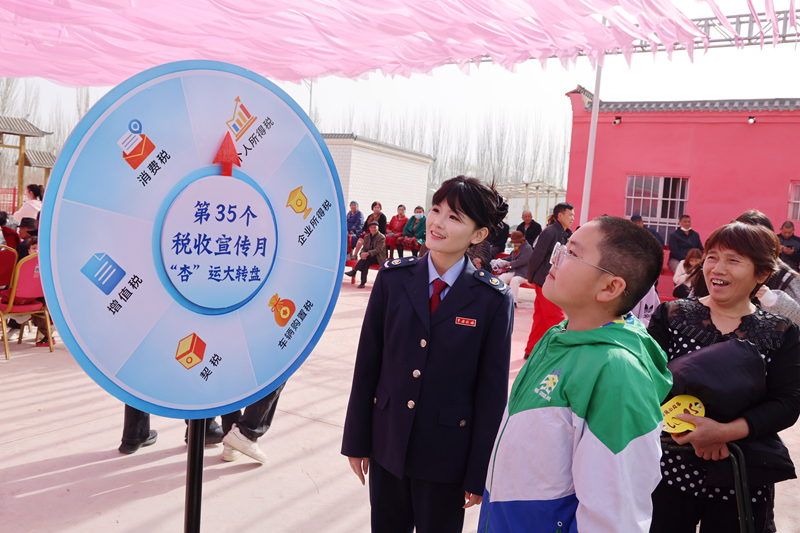图为轮台县税务局在杏花节开展“‘杏’运大转盘”普法宣传活动
