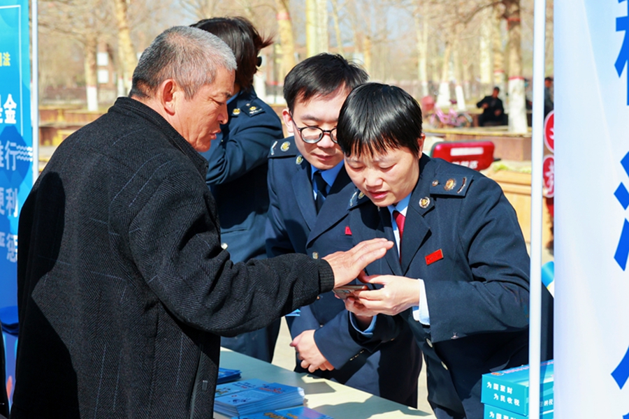博湖县税务局创新采用“现场集中宣传+宣传进商铺”的形式,在阳光社区前,通过搭建宣传咨询台、悬挂税收宣传横幅、摆放政策宣传展板的形式,向过往群众发放宣传手册,面对面解答群众关心的涉税疑问,手把手指导完成发票开具等操作,现场氛围热烈,获得众多好评。