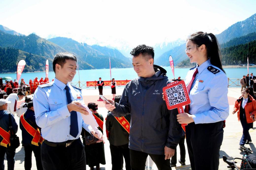 税务干部在天山天池开湖节现场与游客互动交流,讲解“庭好办”线上帮办平台等特色税费服务举措 (徐思庭 摄)
