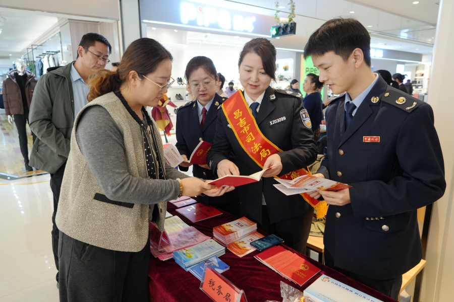 昌吉市税务局税务干部走进辖区商圈,通过普法宣讲、发放资料等形式,向商户和群众普及宪法和税法知识。张雨薇 摄