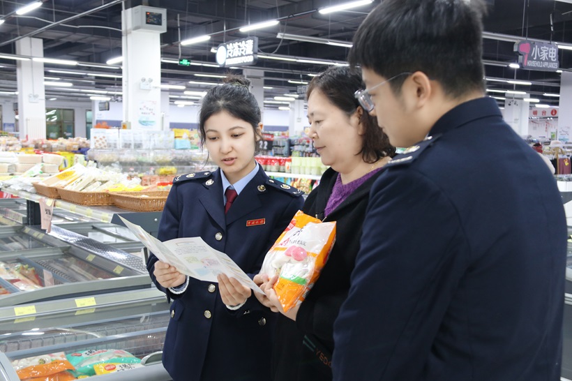 图为:青年干部走进商超了解水饺、馄饨等冬至食品销售情况