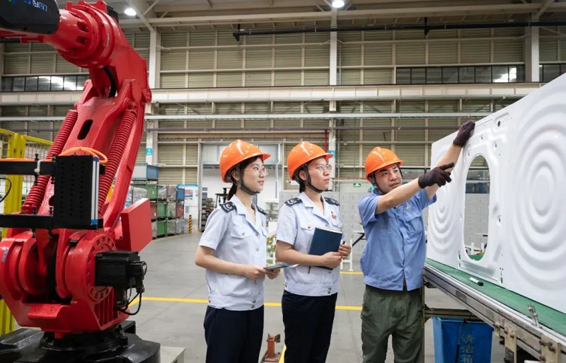 宁海县税务局干部在宁波吉德电器有限公司的智能化工厂内了解洗衣机生产工艺,并开展涉税辅导,帮助企业规范适用税费政策。