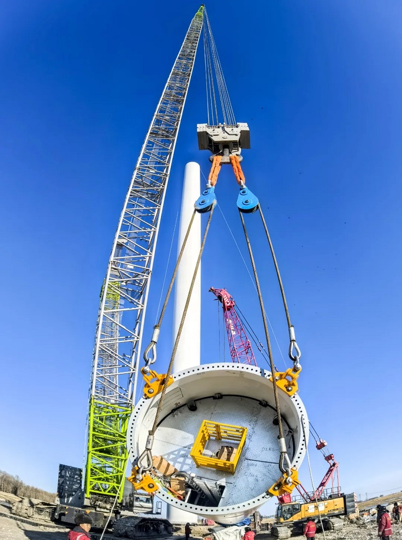 白城市通榆县八面30万千瓦风电项目风机塔吊组装现场。