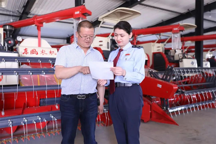 国家税务总局木垒哈萨克自治县税务局税收服务小分队实地走访农机销售公司,宣传退税减税政策,助力涉农企业健康发展。邱会淼 摄