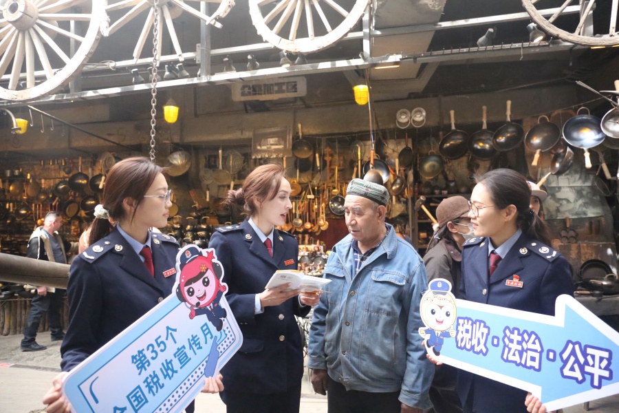 古朴的打铁场景、飞溅的绚烂铁花,不仅吸引着各地游客驻足打卡,也为税务部门开展接地气的税收宣传提供了天然场景。在第35个全国税收宣传月期间,国家税务总局喀什地区税务局干部走进坎土曼铁业公社,依托喀什古城非遗铁艺特色,把税收政策宣传融入游客体验全过程,让税宣在烟火气里落地生根。