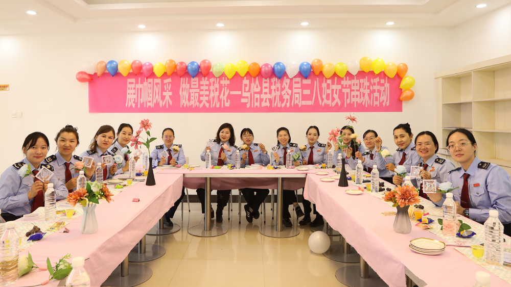 图为 乌恰县税务局开展“展巾帼风采 做最美税花 ”串珠活动,女干部展示亲手制作的精美手串