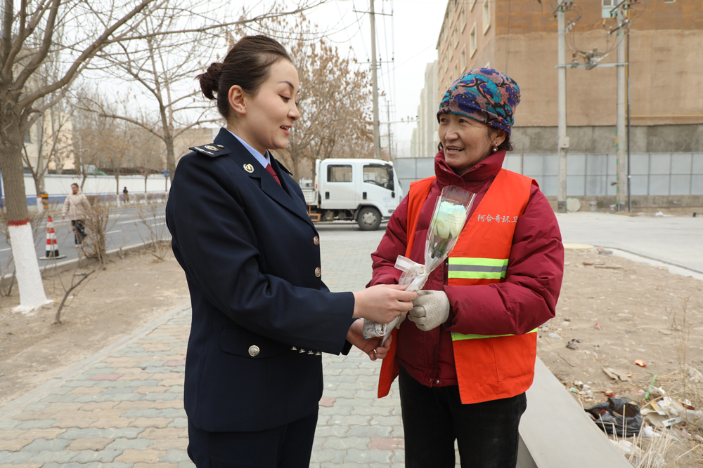 图为 阿合奇县税务局干部为女环卫工人赠送鲜花传递节日温暖