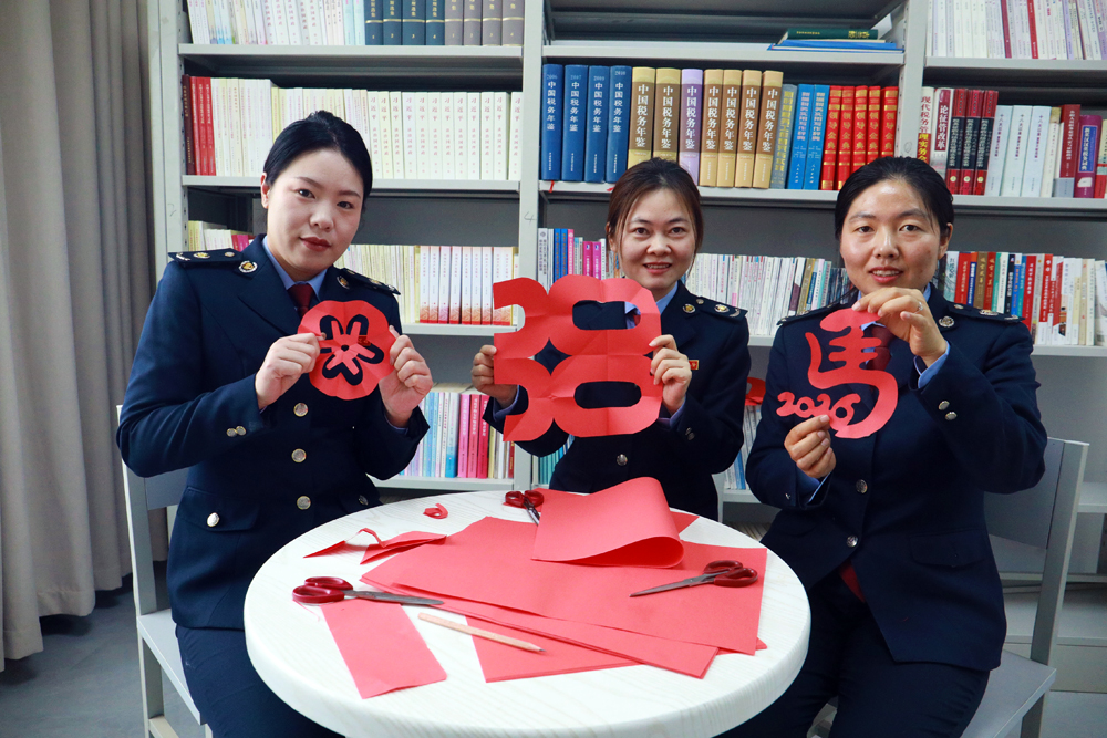 图为 吐尔尕特口岸税务局开展“巧手裁春韵 巾帼绽芳华”剪纸活动,女干部展示剪纸成果