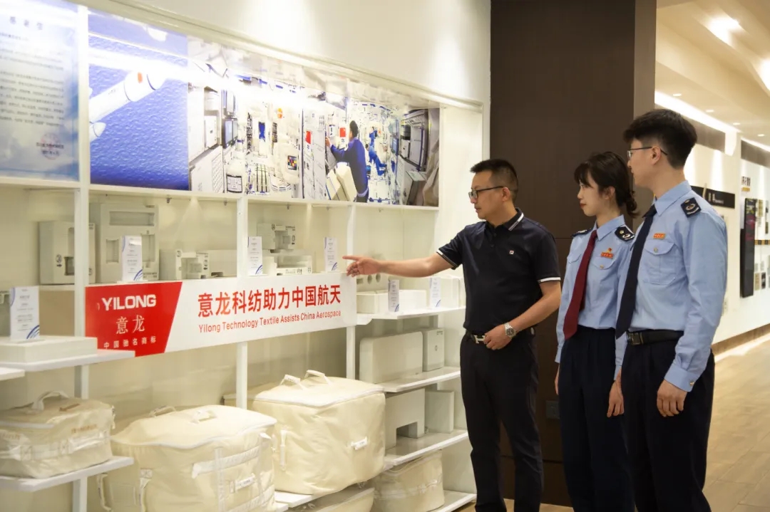 在四川意龙科纺集团股份有限公司产品展厅,工作人员向税务干部介绍公司参与研发的航天专用包覆面料。张天奕/摄