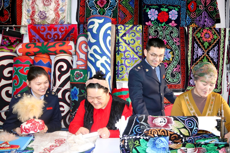 图为 托里县税务局干部走进江波塔民族手工艺品刺绣农民专业合作社开展上门送服务活动