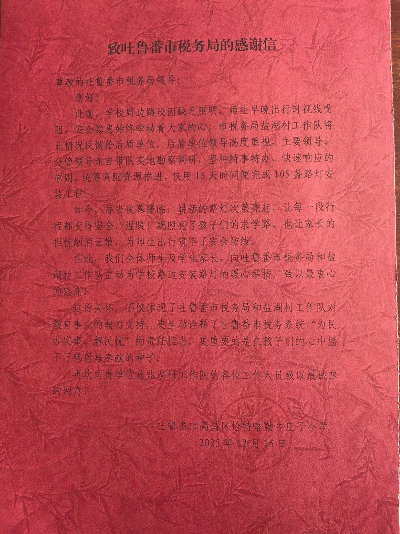 这是后盾单位吐鲁番市税务局心系基层、倾情帮扶,投入13万余元为群众办的又一件实事。恰特喀勒乡盐湖村三组党员村民、四组全体村民为盐湖村驻村工作队送来了一面锦旗,恰特喀勒乡庄子学校给吐鲁番市税务局送来一封感谢信。
