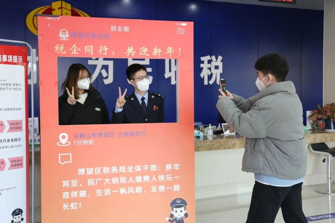 在安徽,马鞍山市博望区税务局工作人员与纳税人缴费人一起庆祝新年。