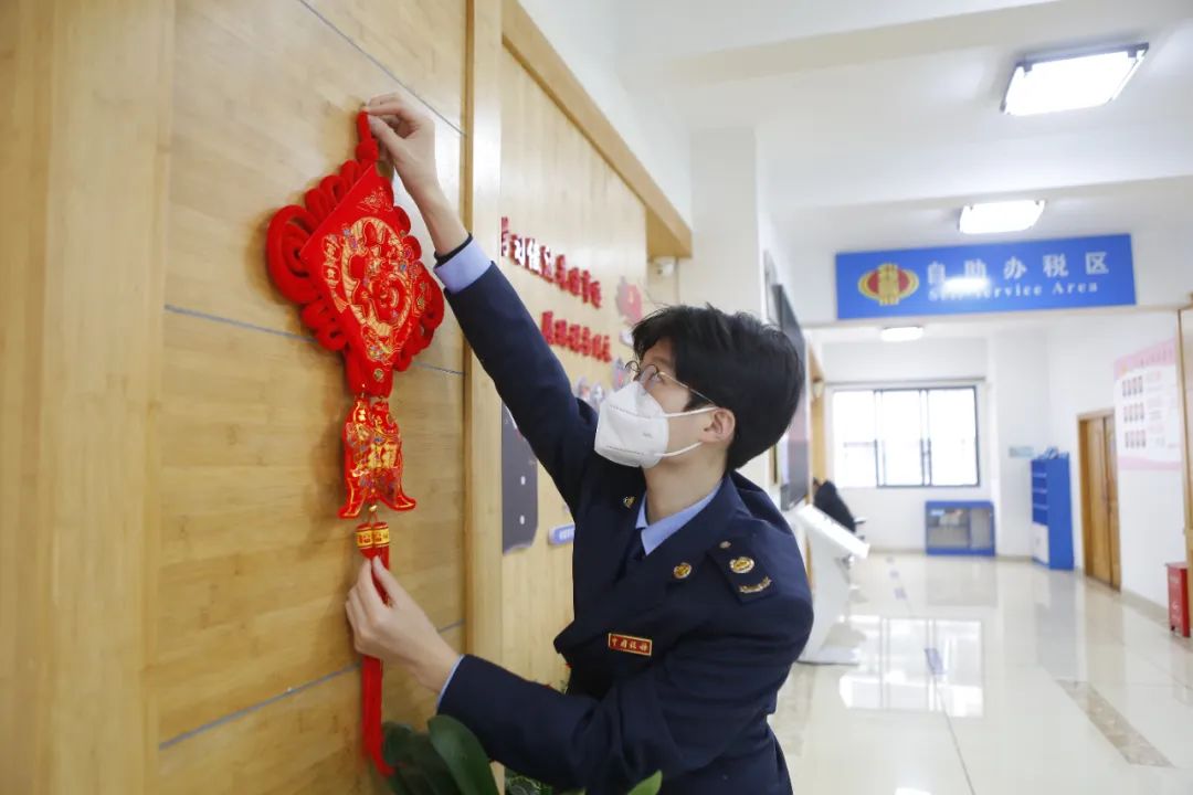 在福建,政和县税务局干部将办税服务厅装扮一新,和纳税人缴费人一起迎接崭新的一年。