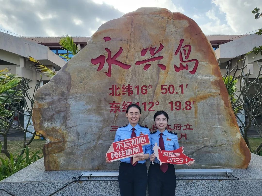 在海南,三沙市税务局驻岛税务干部在永兴岛标志前拍照留念,迎接充满生机和希望的2023年。