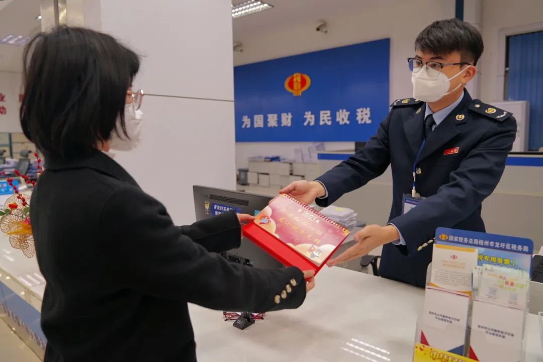 在广西,梧州市龙圩区税务局开展“礼赞党的二十大 踔厉奋发新征程”活动,税务干部为前来办理业务的纳税人送上“办税日历”,送去新年祝福。