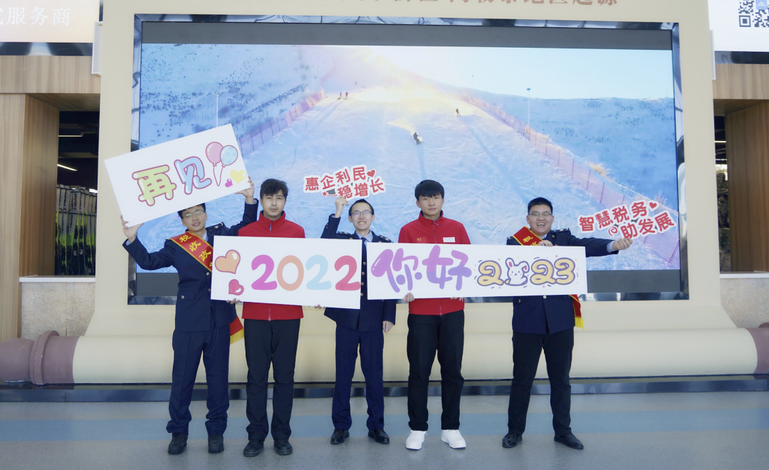 在新疆,青河县税务局干部走进青河县狼山滑雪场开展“税惠相伴 相约2023”税宣活动,与滑雪场工作人员共庆新年。