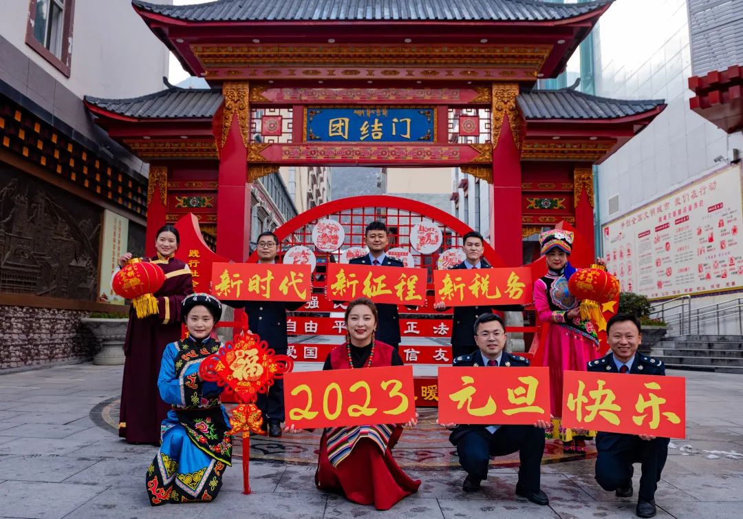 在四川,理县税务局干部在民族团结门前手持新年祝福语,与当地群众共同庆元旦佳节。