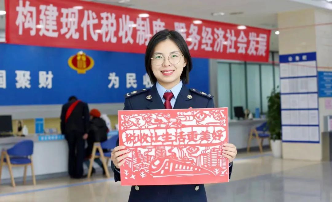 在青岛,市北区税务局的青年干部开展剪纸迎新年活动,税务干部手持“税收让生活更美好”的剪纸作品庆祝新年。