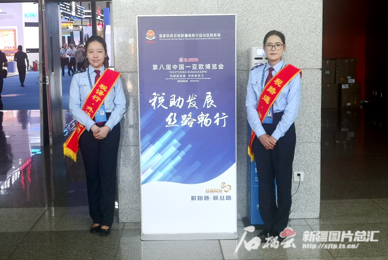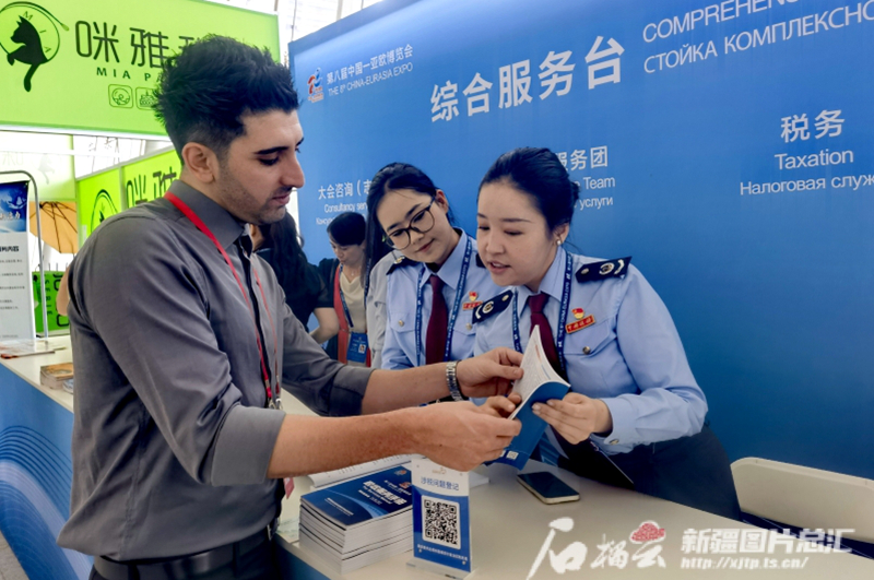 图为 6月27日,在第八届中国—亚欧博览会上,新疆税务局亮出“税路通·新丝路”税收服务品牌。通讯员 文双雪摄
