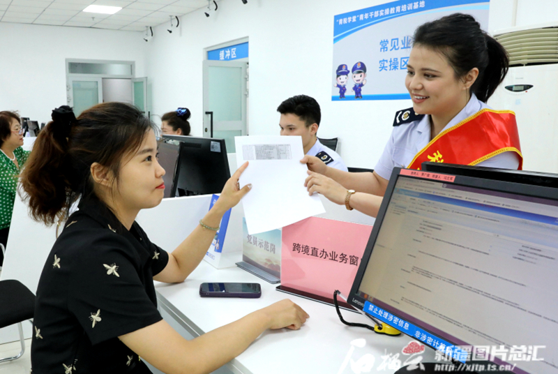 图为 7月5日,在沙依巴克区税务局“跨境直办业务窗口”前,税务干部木尼热·哈力木拉提为跨境企业提供税收业务服务。通讯员 陈冰摄