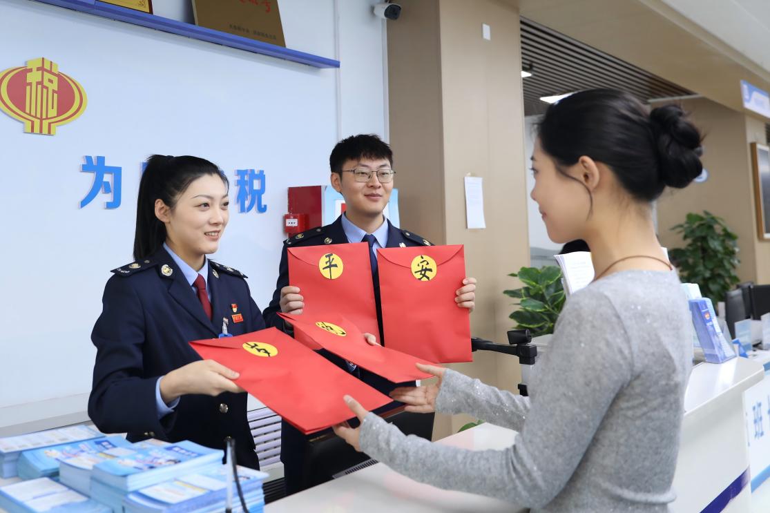 图为 沙依巴克区税务局青年干部为纳税人缴费人送上“岁税平安”政策礼包