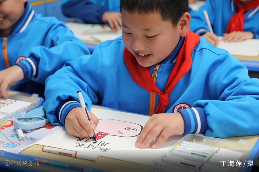 国家税务总局南城县税务局干部走进近溪小学,开展“税润童心·筑梦未来”税收宣传进校园活动。图为在税务干部引导下,孩子们用画笔描绘自己对“税”的理解和感受。