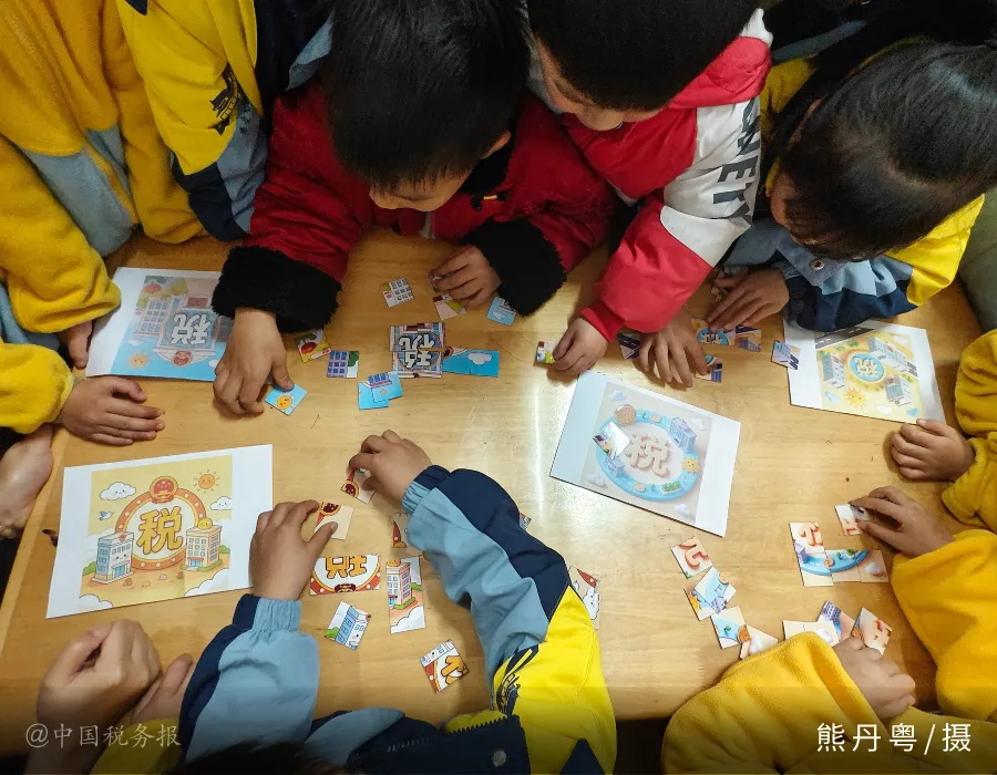 国家税务总局安化县税务局组织干部走进梅城镇紫云幼儿园,开展税法进校园活动。图为孩子们参与“税”字拼图互动,在互动游戏中感悟税收“积少成多、聚沙成塔”理念。