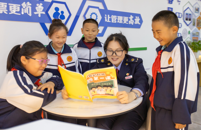 税务干部与青少年一起阅读《我的税收第一课》普法书籍。陆承希摄
