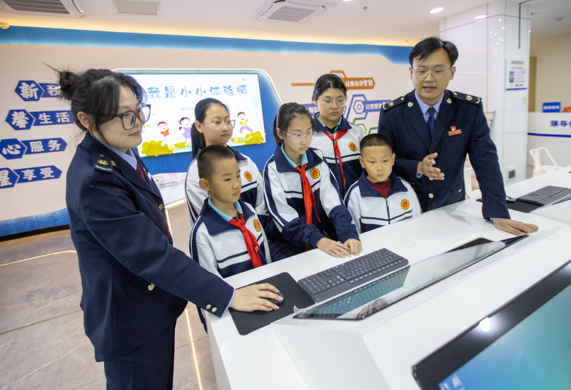 青少年化身小小税务体验师在办税服务厅沉浸式实践体验。陆承希摄