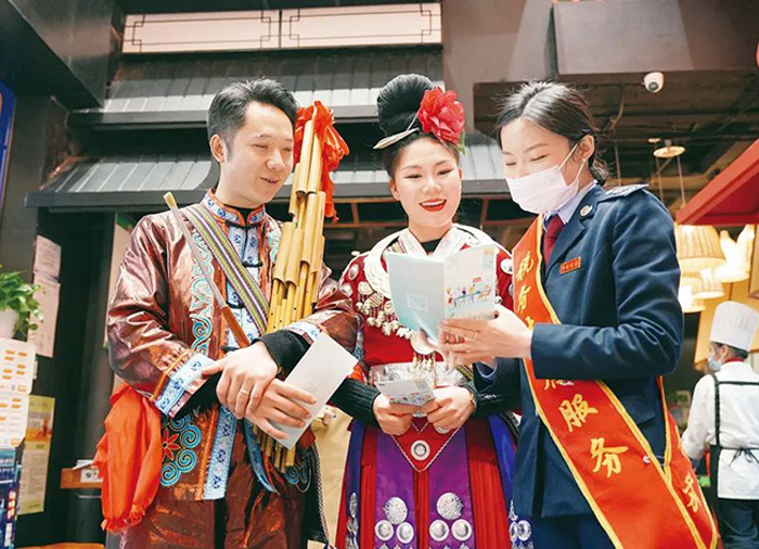今年以来,税务部门优化实施小规模纳税人减征增值税、小微企业和个体工商户减征所得税等一批覆盖面更广的政策,突出对小微企业、个体工商户的支持。图为2023年3月16日,国家税务总局贵阳市南明区税务局干部走进当地国家非遗项目酸汤鱼餐饮店,讲解税收优惠政策。