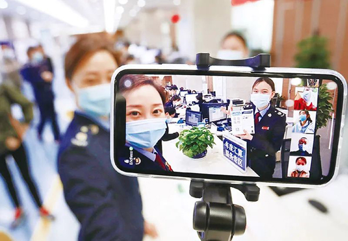税务部门持续创新提升税费政策服务效能,在连续第10年开展的“便民办税春风行动”中,推出一系列减环节、减资料、减时间、减成本的创新服务举措。图为2023年4月24日,国家税务总局西安国家民用航天产业基地税务局干部化身“主播”,向纳税人提供个性化政策宣讲解读及办税指引。