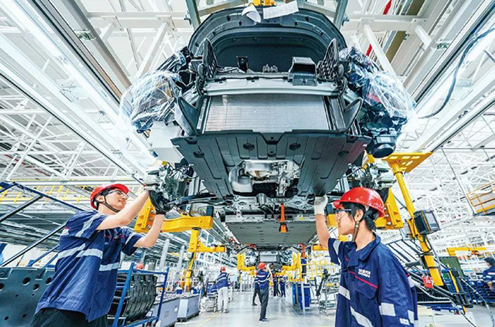 根据党中央、国务院统一部署,我国新能源汽车车辆购置税减免政策将延长至2027年底。图为2023年8月18日,位于江苏南京市溧水区的南京长安汽车新工厂,工人们正在组装全新长安新能源SUV,一辆辆新车迅速完成组装、下线,生产氛围火热。