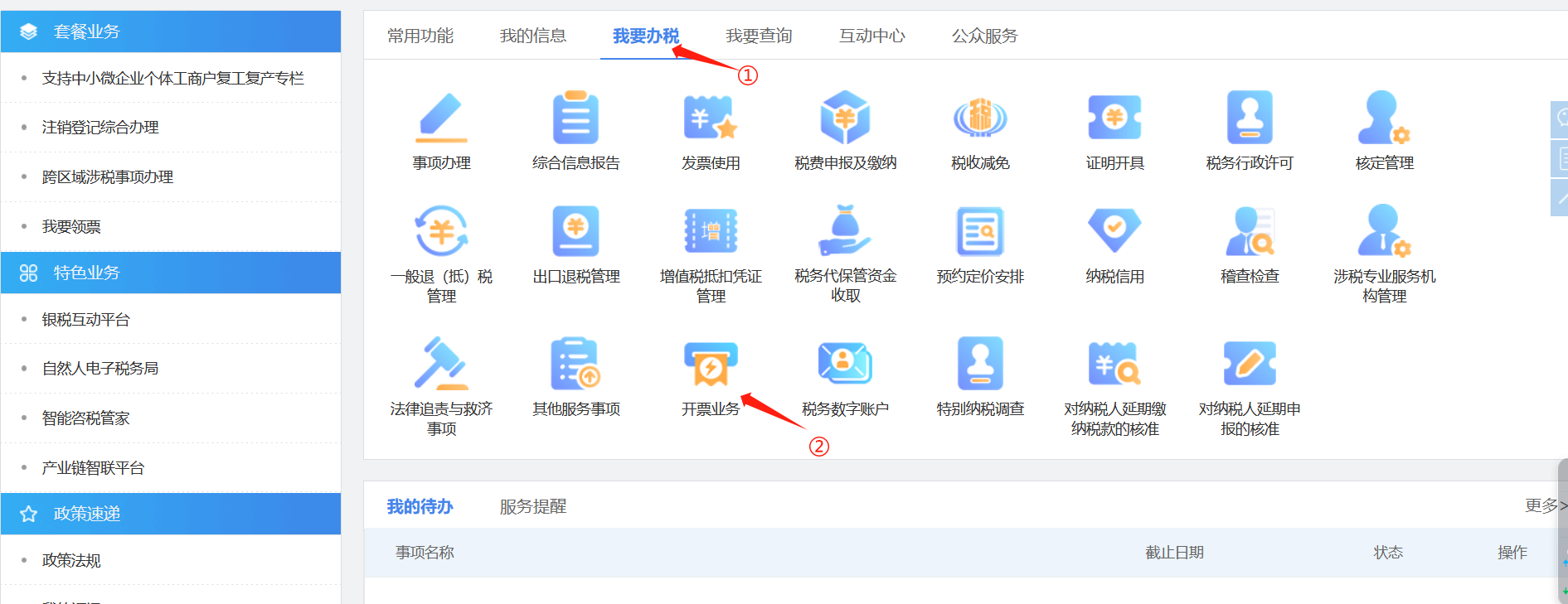 ①纳税人登录电子税务局,依次选择【我要办税】--【开票业务】,如图 1所示。