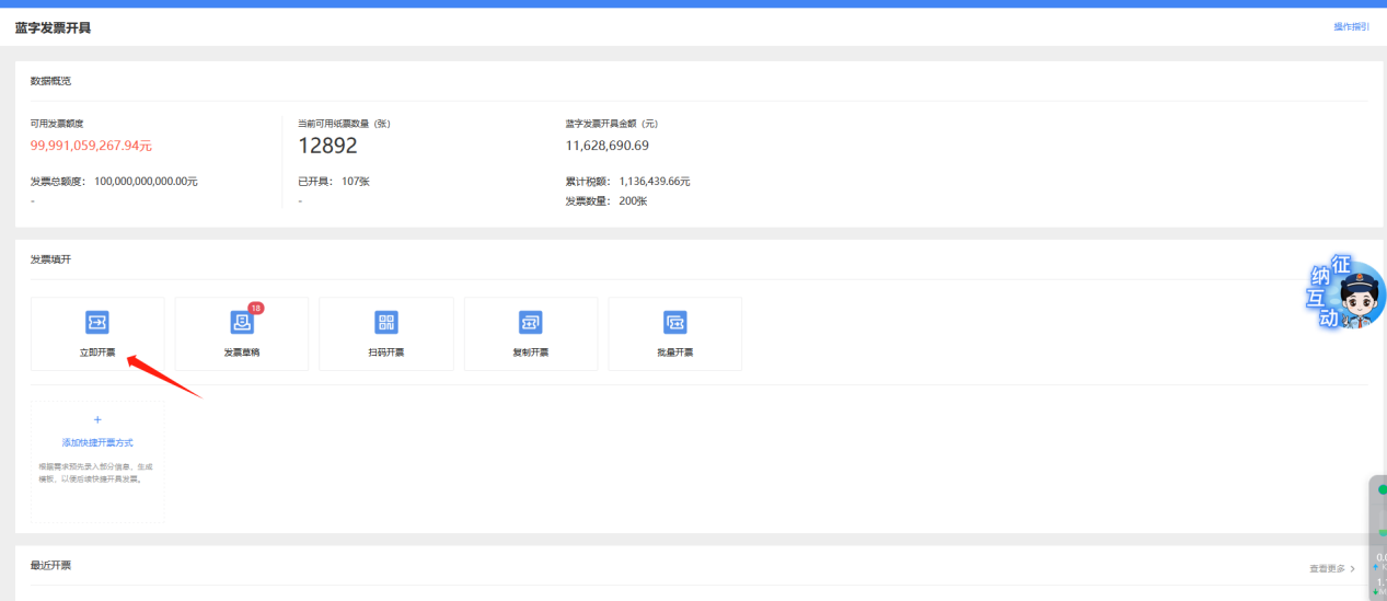 ③进入蓝字发票开具的二级功能界面,界面展示数据概览、发票填开、最近开票等区域,点击发票填开中的【立即开票】,如图3所示
