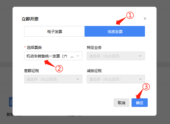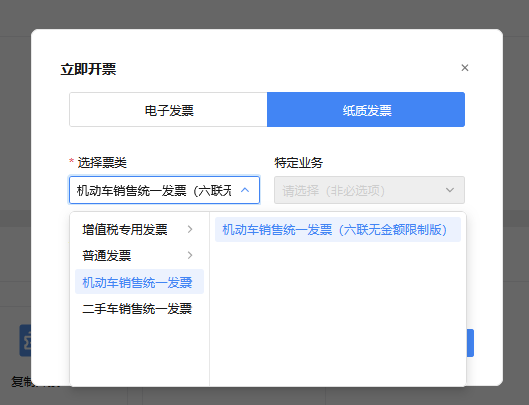 ⑤首先更改票种,选择“纸质发票”,再点击“选择票类”中的下拉列表,选择“机动车销售统一发票”,弹出机动车销售统一发票的二级菜单,选择“机动车销售统一发票(六联无金额限制版)”,如图 5所示;选择好票种、票类后,点击确认,如图 6所示。