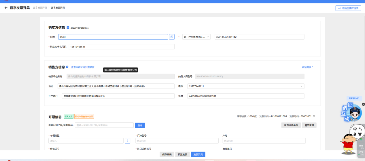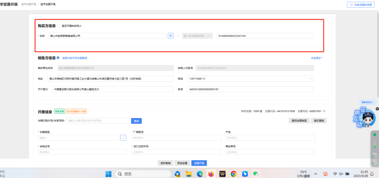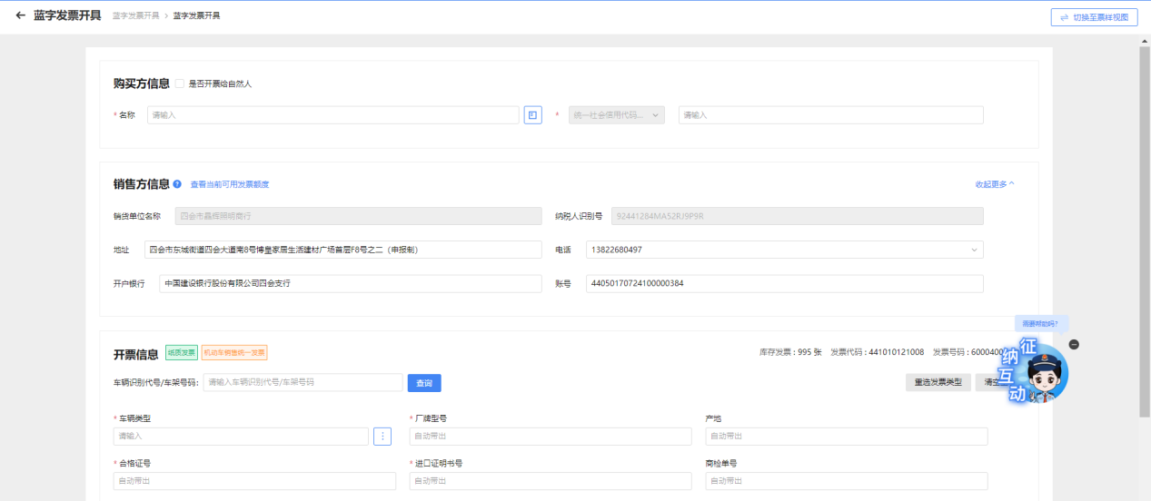 ⑥默认进入发票开具表单视图,销售方信息会自动填充已备案好的销售方信息,如图 7所示。